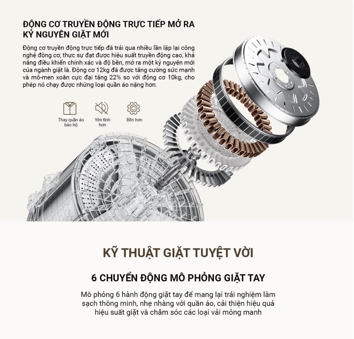 - Động cơ truyền động trực tiếp DD: Giảm ma sát và tiếng ồn, mang lại hiệu suất giặt êm ái, với tiếng ồn chỉ 52dB.