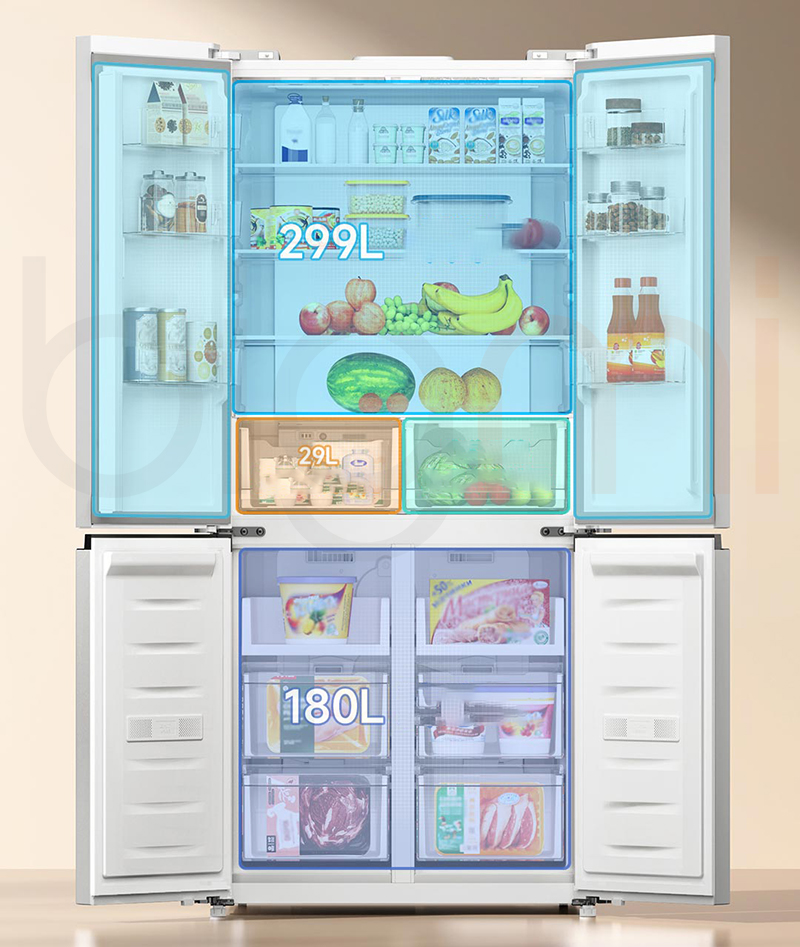 Với dung tích khổng lồ 508L, tủ lạnh Mijia chia thành 18 ngăn lưu trữ tiện lợi, phù hợp cho mọi loại thực phẩm. Ngăn mát chiếm 299L, ngăn đông 180L, và một ngăn bảo quản đặc biệt 29L cho đồ khô và ướt. Thiết kế này giúp tối ưu hóa không gian và đảm bảo mọi thực phẩm được bảo quản một cách khoa học.